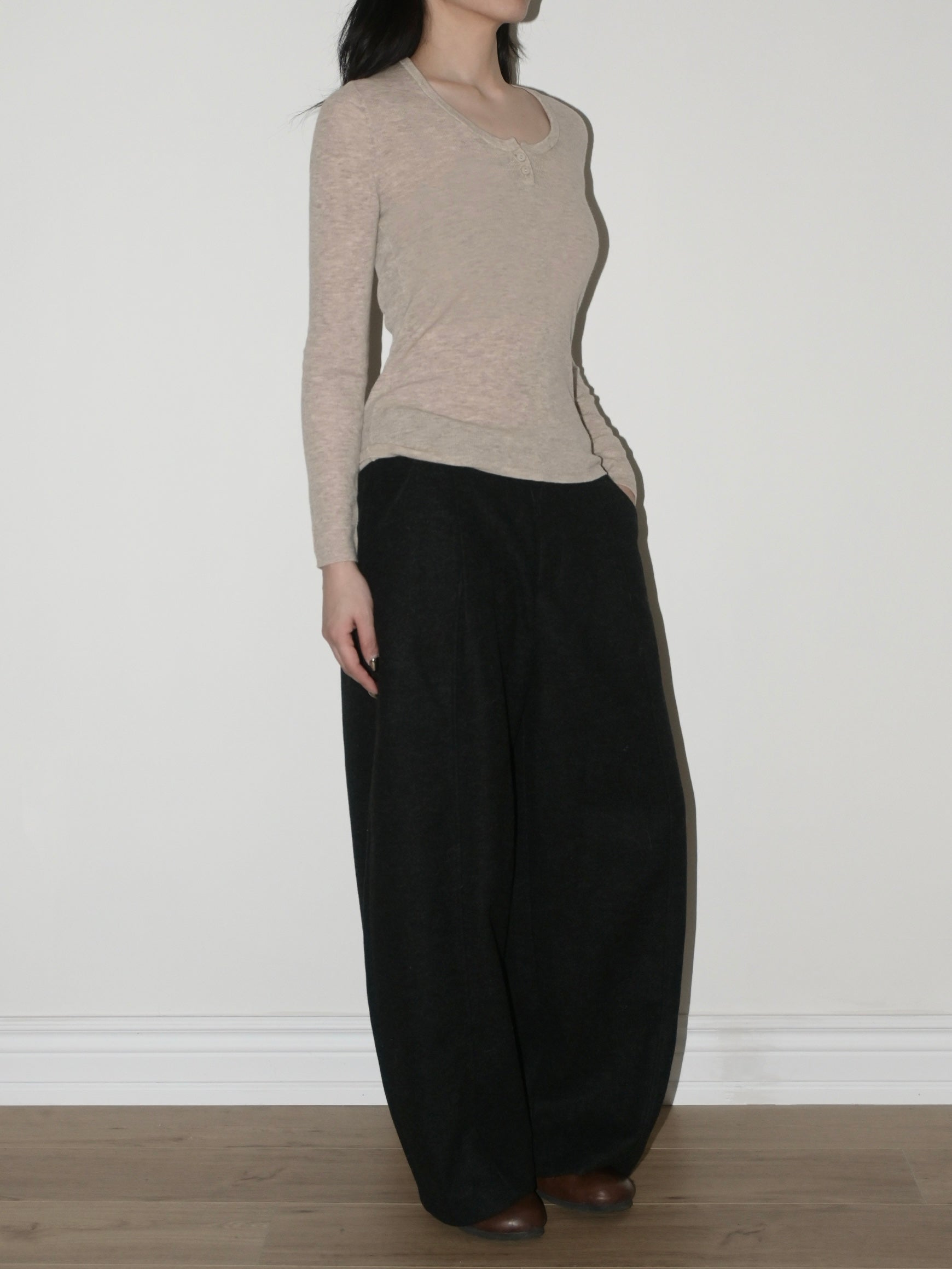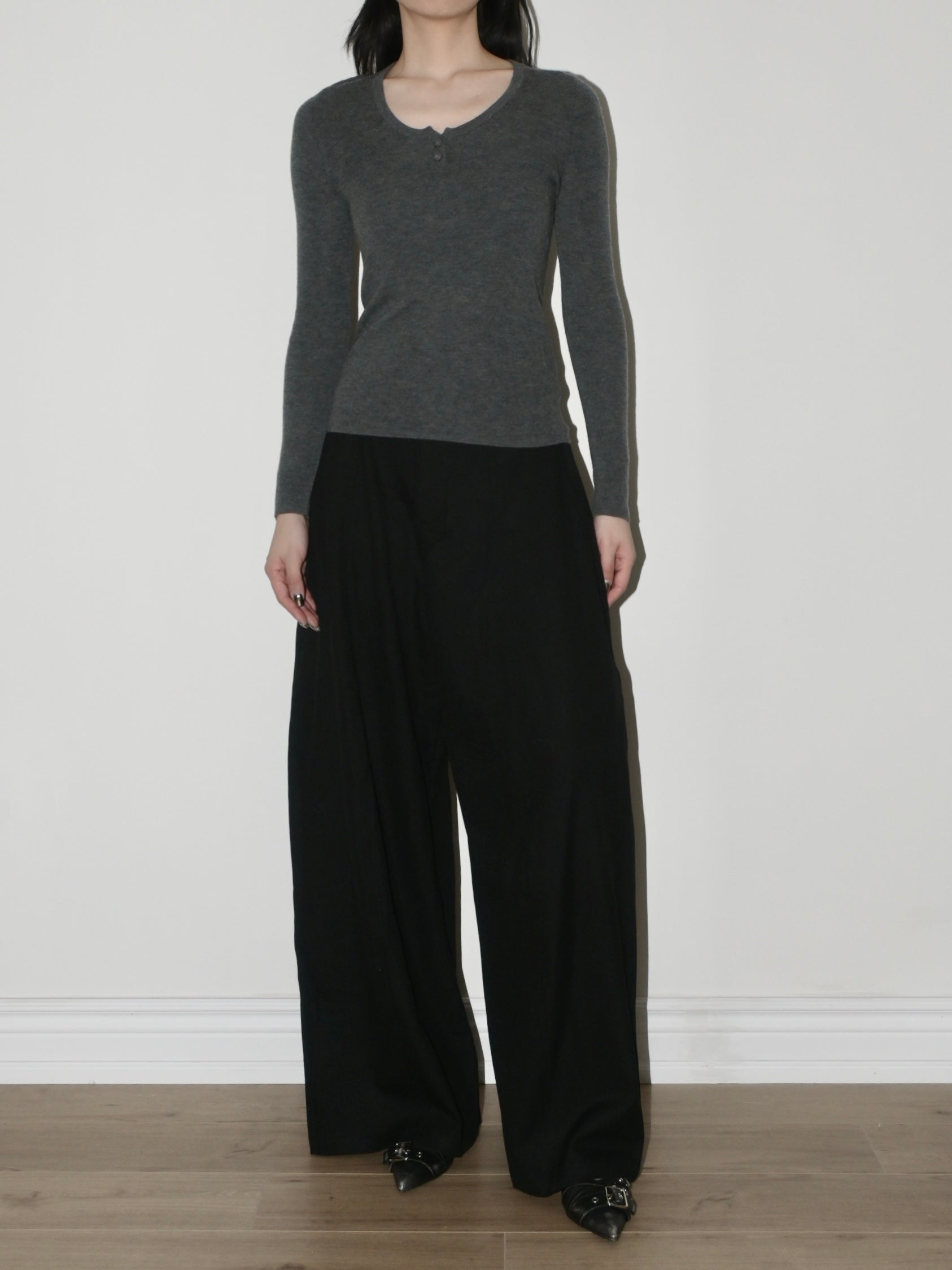 - Scoop neck and button placket
